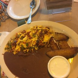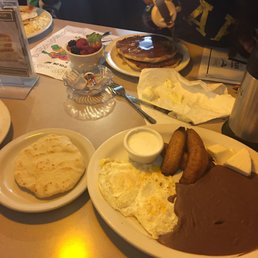 I've passed by this place so many times on the freeway and finally stopped here upon the suggestion of a friend when we were deciding where to meet. This was the perfect spot for us for a 10AM breakfast. The girls working here were so welcoming and patient. They had a breakfast menu in addition to their pupusa menu. You can order anything. I went w/the "Platano favorite": 3 scrambled eggs w/veggies, refried beans, sweet fried plantains and side of Salvadoran chorizo and sour cream and tortillas. The plantains were amazing and perfectly cooked. We both agreed we could eat a whole plate of that alone. The eggs were okay bc they had a bit of a sour taste to them....maybe it was the seasoning. The chorizo was a bit dry for my liking and not like Mexican chorizo, so just keep that in mind. The beans were delicious and apparently you're supposed to eat the beans, sour cream and plantains together in the same bite according to my Salvadorian friends when I asked them after the fact. Ooops! My friend and I both ordered coffee and were brought a carafe to share. The girls were attentive and would frequently check on us to see if we needed anything else. It was a calm ambiance for a Saturday morning for my friend and I to chit chat and drink coffee like little old ladies :) I ordered to-go one of their lunch specials which included 2 pupusas, side of plantains, refried beans and sour cream. Hubby thoroughly enjoyed his lunch :) I would love to return here next time and try their pupusas.